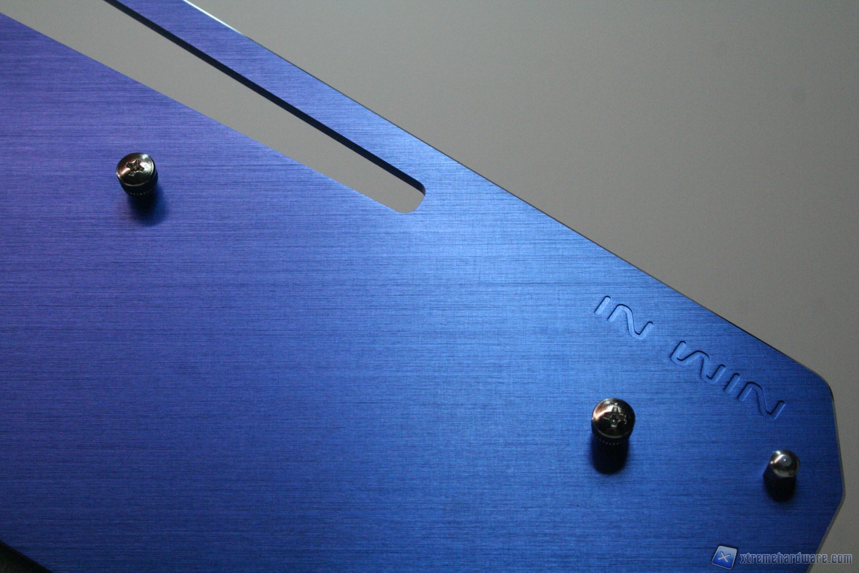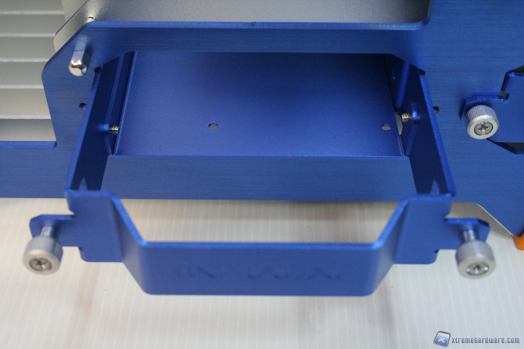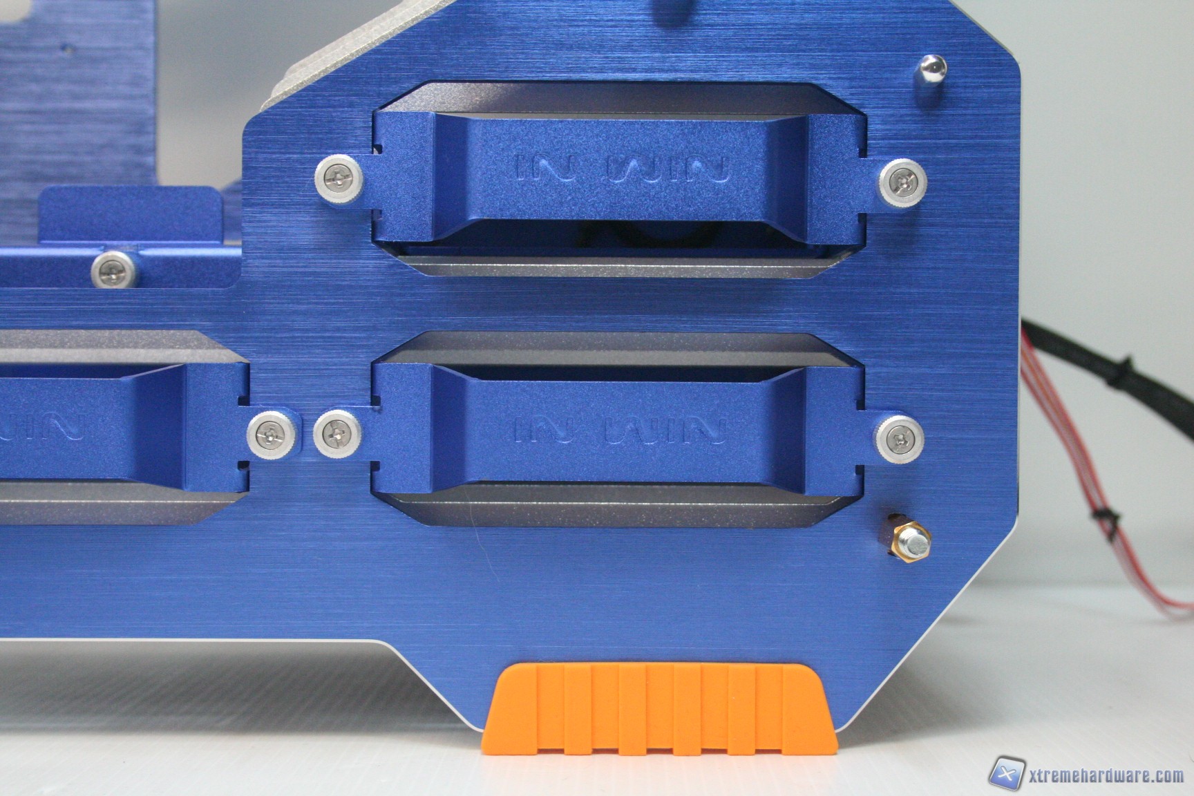 E’ possibile installare due ventole da 120mm quindi la compatibilità risulta fortemente limitata, però bisogna precisare che a differenza delle altre soluzioni, essendo questo un modello completamente aperto, la dissipazione sarà già massima in partenza per la CPU. Per la GPU il discorso cambia e per via di alcune ragioni: l’assenza di ventilazione dedicata qualora non fosse installata la ventola frontale da 120mm e la struttura ATX, che porta quindi ad un riscaldamento del PCB posteriore della VGA, cosa che non succede con modelli sullo stile Silverstone. Facciamo presente che un simile accorgimento è stato invece adottato nell’IN WIN D-Frame. Come elementi caratteristici sono presenti quattro sospensori gommati di colore giallo alla base ed ovviamente la colorazione blu dei plate centrali, che contrasta con quella in grigio degli elementi laterali dei plate stessi. In breve vengono creati dei contrasti cromatici che dal vivo certamente portano ad un fortissimo impatto estetico. Qualora fossero stati scelti dei toni diversi però ad esempio il nero o bianco, assieme all’arancione del modello presentato al Computex oppure rosso fegato, probabilmente l’impatto sarebbe stato più aggressivo, e forse appropriato data la struttura. Facciamo presente che sono presenti due plate laterali con un incavo che funziona da maniglia. Sarà possibile sollevarlo tramite queste maniglie grazie alla grandissima rigidità complessiva del telaio.