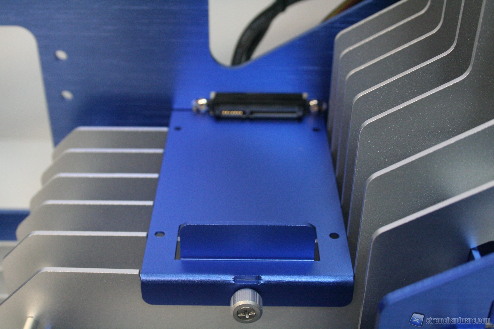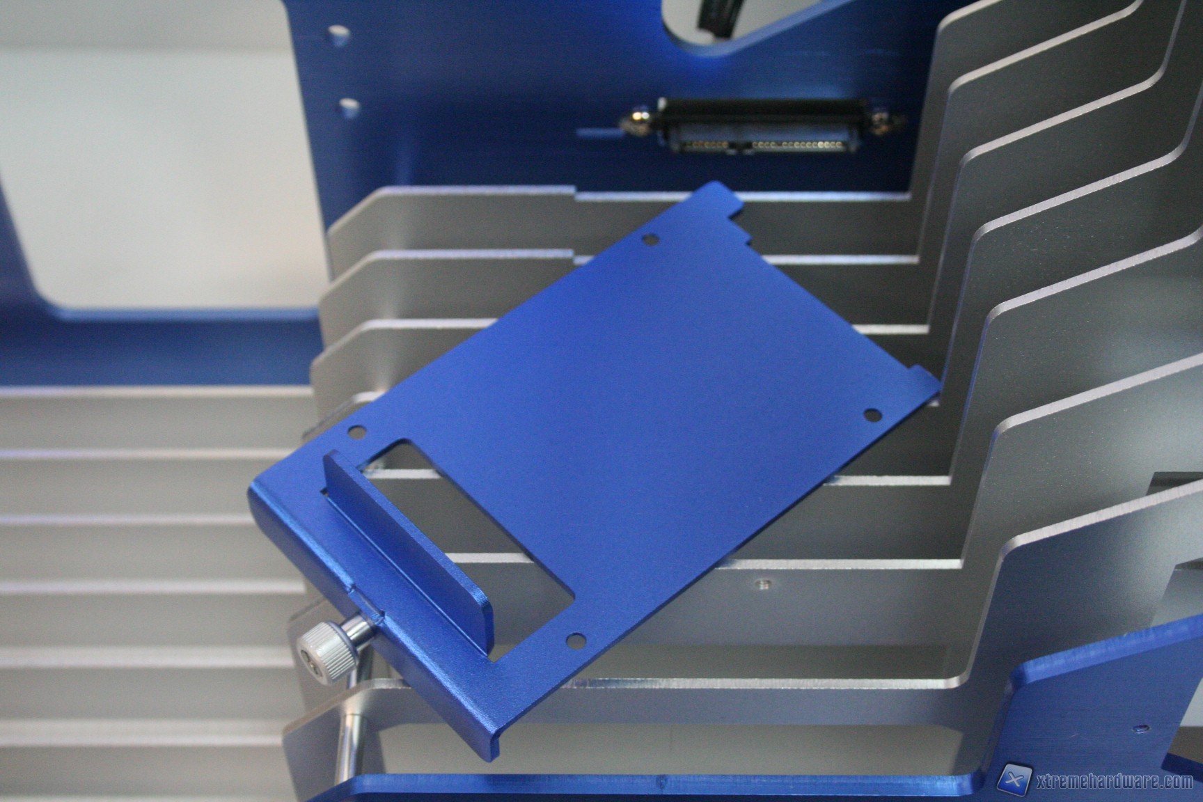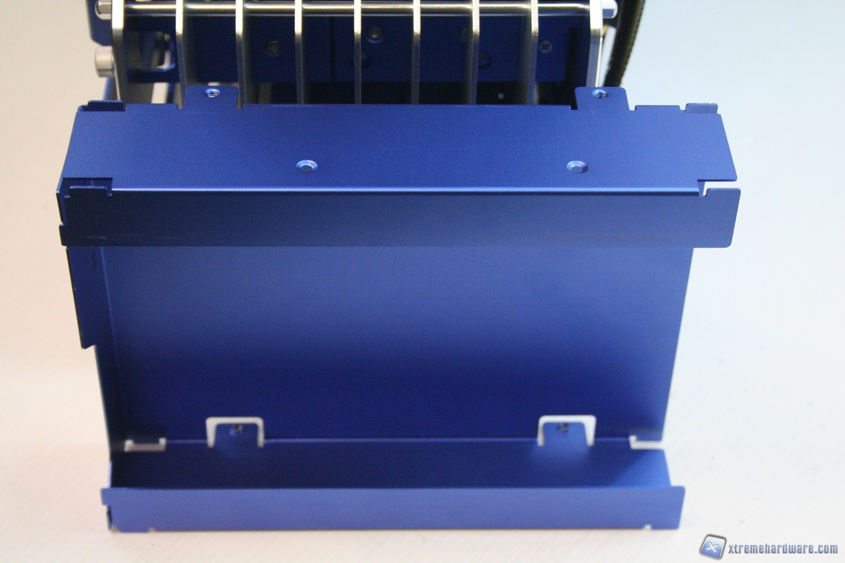 Il layout interno è moderno, senza esagerare in dimensioni; questo comporta però che la tolleranza in profondità per dissipatori aftermarket e lo spazio superiore per il cablaggio sono limitati. Presenta elementi innovativi tra cui prima di tutto il sistema di installazione dei dischi rigidi, leggermente problematico qualora i plate non fossero riposti correttamente, ma molto rigido e soprattutto, tool-less. L’orientamento della scheda madre è classico ATX, il posizionamento dei bay per gli hard disk è nella parte laterale sinistra e frontale, con orientamento orizzontale. E’ standard anche il posizionamento delle periferiche da 5.25” anche se c’è un inclinazione verso il basso particolarmente accentuata, possibile grazie ad un sistema di blocco removibile. Non c’è separazione fra i diversi scompartimenti, che porterebbe ad un isolamento a livello termico, data la struttura aperta. La colorazione interna è completamente blu/grigia e non sono presenti guaine in gomma per il passaggio dei cavi.