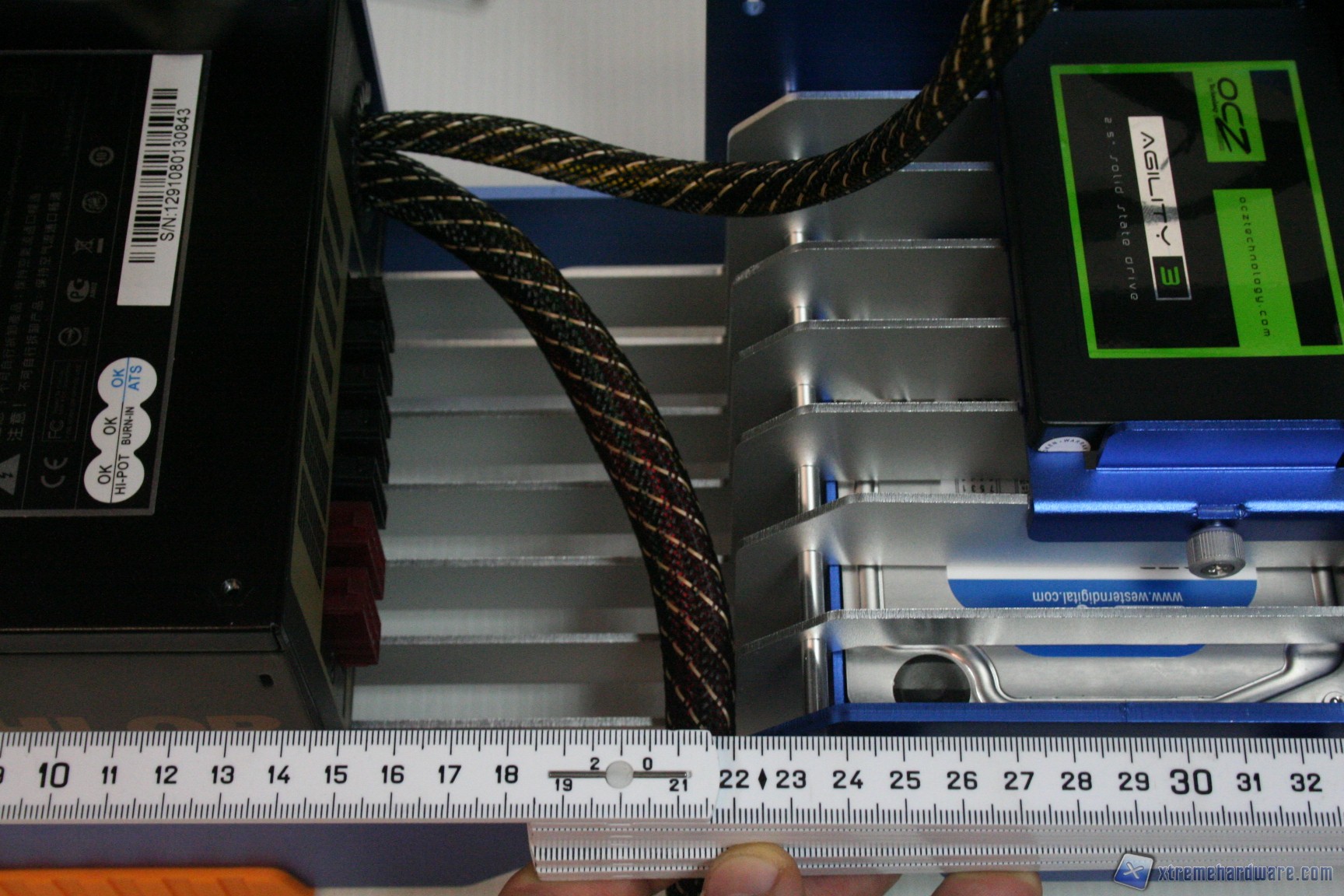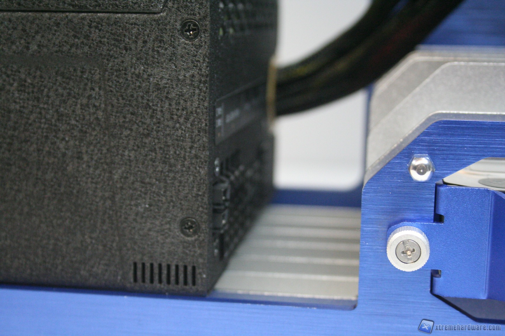 Il posizionamento dell’alimentatore è classico, quindi nella parte inferiore e posteriore dello chassis. E’ possibile installare due distanziatori gommati forniti nel bundle e la lunghezza massima consentita è pari a 22cm, anche se è consigliabile non andare oltre i 18. Si inserisce facilmente ed il fissaggio avviene tramite consuete viti filettate posteriori, tool-less. Il cablaggio però è leggermente caotico in quanto non esiste un sistema per il passaggio forzato dei cavi, e purtroppo notiamo che IN WIN dovrebbe porre maggiore attenzione in materia, similmente a quanto già visto per l’X-Frame. Ricordiamo che è comunque possibile acquistare dei passacavi adesivi, in ferramenta. Anche in questo caso, data la particolarità del prodotto, data la struttura assolutamente atipica e data l’organizzazione interna assolutamente peculiare, è comprensibile che ci sia qualche elemento da rivedere, o migliorare in futuro. Comunque sia come potete osservare dalle foto il problema è decisamente relativo e basta un minimo di organizzazione dei cavi per risolverlo, ed ottenere un buon risultato.