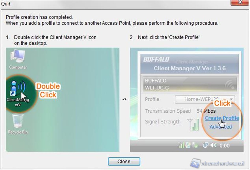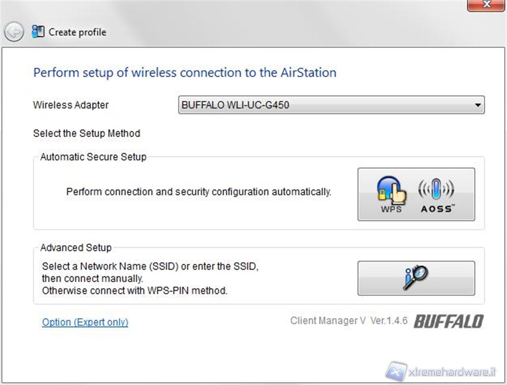 Ci verrà quindi richiesto di creare un profilo per la connessione. Grazie alla funzione AOSS presente su entrambi i dispositivi non ci sarà bisogno di inserire PIN o password, ma basterà cliccare sul pulsante AOSS nella schermata e successivamente tenere premuto il pulsante AOSS del router per circa 3 secondi (fino a quando la spia luminosa non lampeggia). Il sistema connetterà automaticamente l’adattatore N450USB al router HighPower N450.